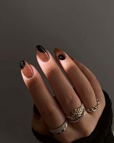 Магнітні варіанти манікюру знову завойовують серця модниць. Найтрендовіші кольори – коричневий і бургунді. Але, якщо у вас не вийде знайти магнітний лак, замініть його на блискучий темний варіант і прикрасьте чорним дизайном.