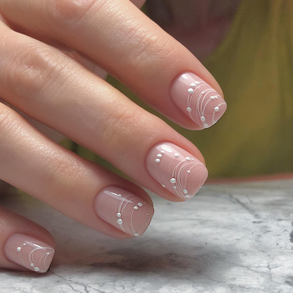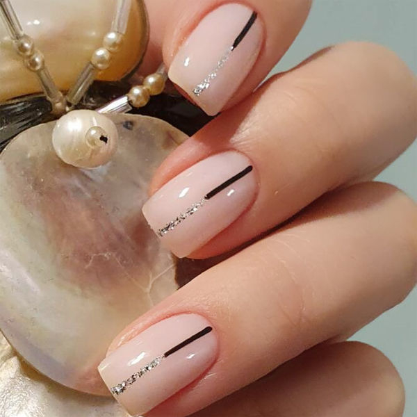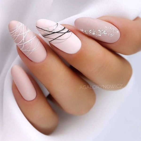 Трисекундний дизайн, який освіжить класичне нюдове покриття та додасть манікюру родзинки. Якщо ви прагнете додати нігтям ширини, розташовуйте витки павутини по горизонталі в точках росту нігтьової пластини або діагонально, але теж ближче до точок росту. Якщо дизайну, на ваш погляд, не вистачає святковості, капніть пару блискіток або використовуйте матовий топ з пластівцями поталі.