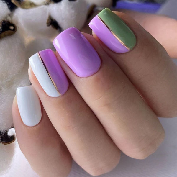 Цікавий і простий дизайн, який дуже швидко прибирає ширину нігтьової пластини. Зона стику кольорових гель-лаків акцентована (або захована – якщо у майстра не вийшла ідеальна пряма лінія) тонкою клейовою металізованою смужкою, і це в даному випадку виглядає досить вдало. Однак, ви можете обійтися просто чіткими «половинками», і таке рішення вже компенсує ваш дискомфорт.