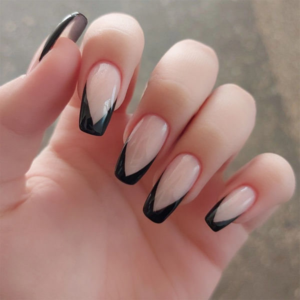 Тут завдання вирішується в три дії: робимо квадратну форму, виконуємо вирівнювання нігтьової пластини з невеликим додаванням матеріалу по центральній осі (щоб її візуально підняти) та малюємо темний френч, який зводиться на чіткий трикутник до центру. Темні відтінки в боках на кінчику ховають зайву ширину, яка залишиться після вирівнювання, і нігті перетворюються на елегантний квадрат. Бінґо!
