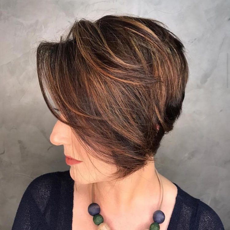 Градуйований варіант подовженого боба надає додаткового об’єму локонам, омолоджує образ. Він добре виглядає на густому і тонкому волоссі. Його варіація з чубчиком на бік відволікає увагу оточуючих від вікових дефектів шкіри і надати образу елегантного вигляду.