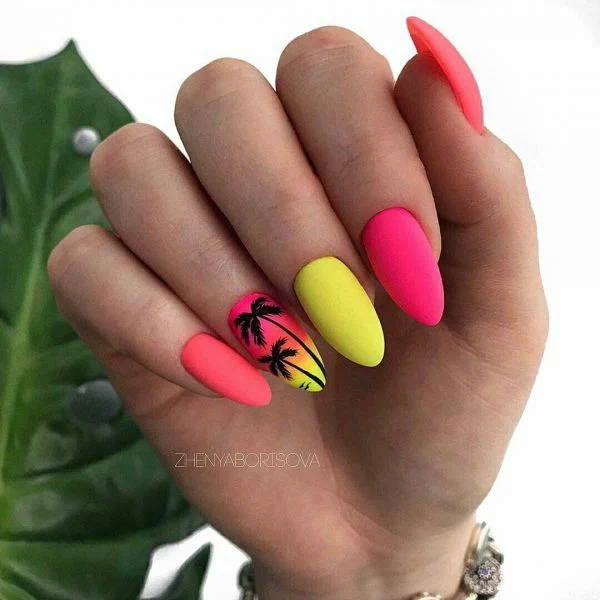 Салатовий, бірюзовий, лимонний, світло-жовтогарячий, яскраво-рожевий манікюр літо 2022-2023 подарує справжній літній настрій. Райдужні відтінки добре поєднуються, вони чудово підходять для основи манікюру з фруктовими малюнками. Дивіться, як чудово виглядає неоновий літній манікюр на фото нижче.