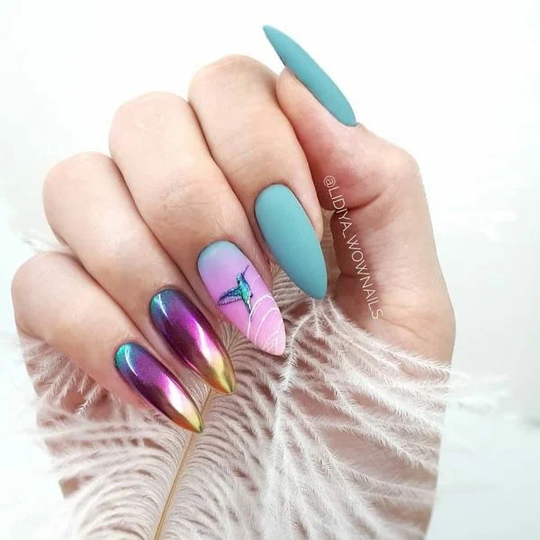 Не втрачають своїх позицій і дзеркальний та хромований манікюр. Однак у чистому вигляді його застосовують дуже рідко. Найчастіше це літній манікюр із втиранням на одному пальці, решту покривають однотонним лаком, або поєднують кілька технік, як це видно на фото.
