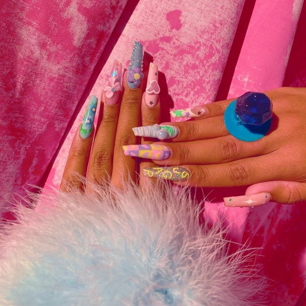Кайлі Дженнер завжди знає, що буде в моді, тому вже давно передбачила тренд на незвичайний психоделічний манікюр. Особливо красиво вони виглядають в приглушених пастельних тонах.
