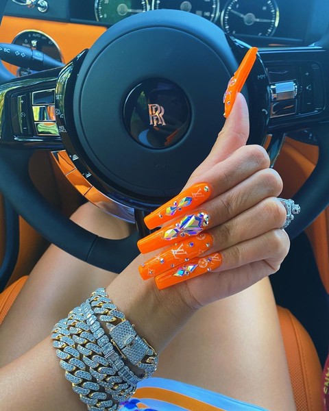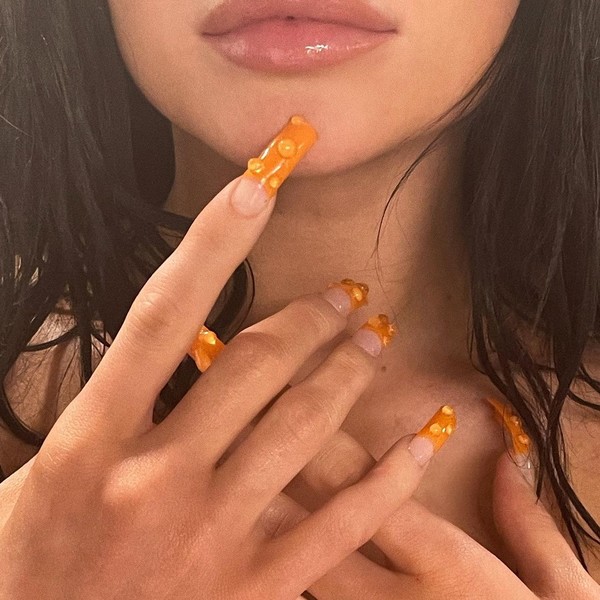 Золотисте, руде та жовтувате листя задає настрій осені, тому помаранчевий – це осінній колір. Спробуйте його в будь-яких відтінках і варіантах. До речі, цікаву ідею пропонує Кайлі Дженнер – прикрасьте манікюр 3D-візерунком з крапель.