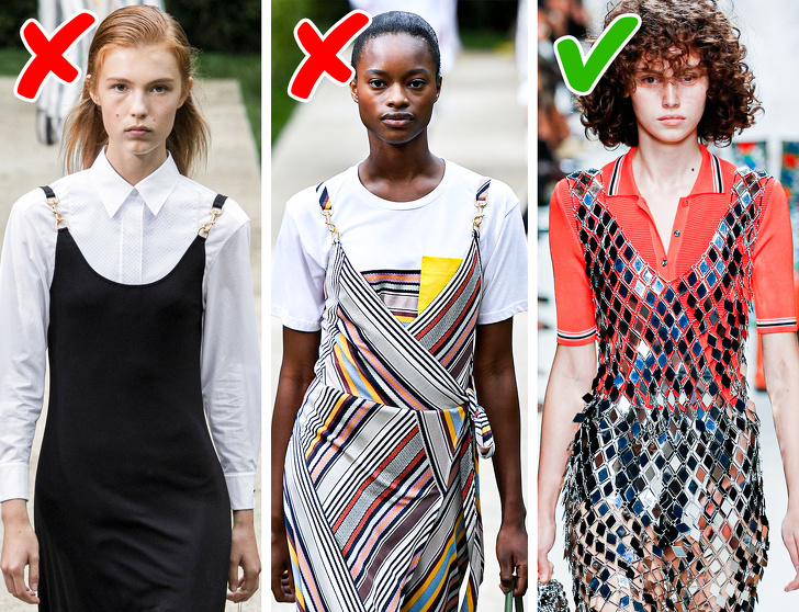 Сорочки під сукнею більше не актуальні, а бренд Miu Miu взагалі заявляє, що і самі сукні – вчорашній день, пропонуючи їм на заміну сарафани, які більше схожі на шкільні. Що стосується дуету футболки та сукні, то такий варіант можливий, якщо ви одягнете поло. У 2020 році теніску радять носити у всіх можливих варіаціях: під сукнями і поверх, зі строгими костюмами або, як на шоу Paco Rabanne, під кольчугою.
