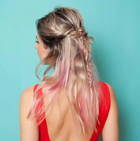 Фігурна складна косичка на напіврозпущеному волоссі виглядає просто чудово! Якщо ви не вмієте плести складні коси, підійде абсолютно звичайна. Обіграйте її цікаво – заплетіть не до кінця і не дуже туго.