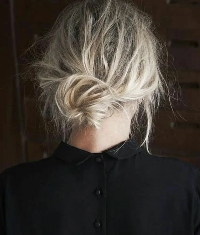 Цей пучок виглядає так, ніби волосся не розчісували пару днів. Але при цьому воно чисте та доглянуте, а це головна відмінність модного недбалого стилю від неохайного вигляду.