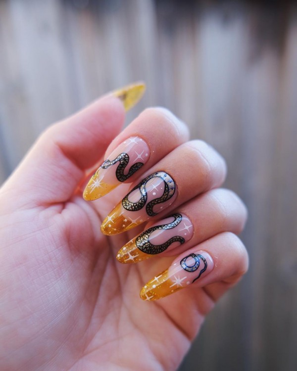 Чорні зірочки, намальовані на всіх або кількох нігтях підійдуть до будь-якого вбрання, будь то піжама, сукня або брючний костюм.