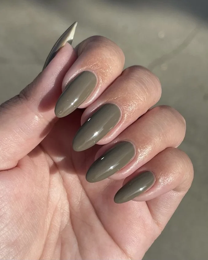 Гарний глянцевий манікюр кольору хакі можна залишити в мінімалістичному виконанні або ж доповнити колоритним і шикарним осіннім дизайном в приглушених відтінках.