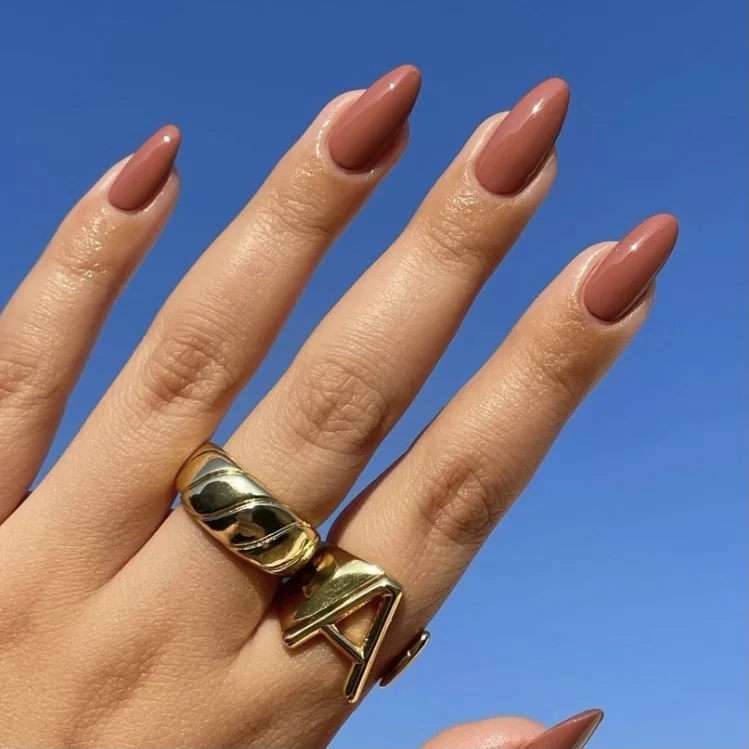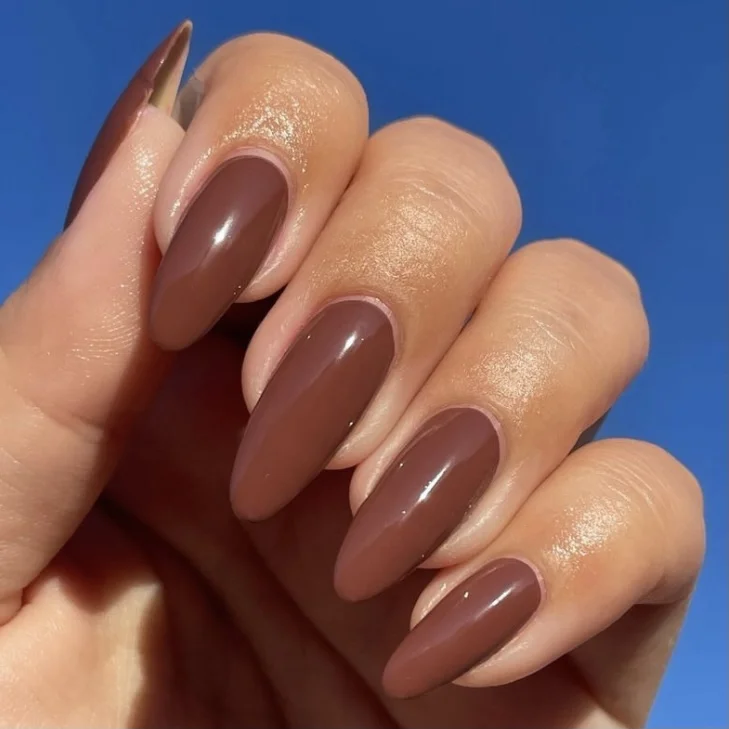 Пряна шоколадна палітра, яка максимально асоціюється з осіннім періодом, буде на піку популярності у цьому сезоні. Достатньо виконати однотонне покриття в комплементарному кавовому кольорі і ваші ручки матимуть охайний і сучасний зовнішній вигляд. Цей колір в манікюрі чудово перегукується з затишними в’язаними виробами різного формату.