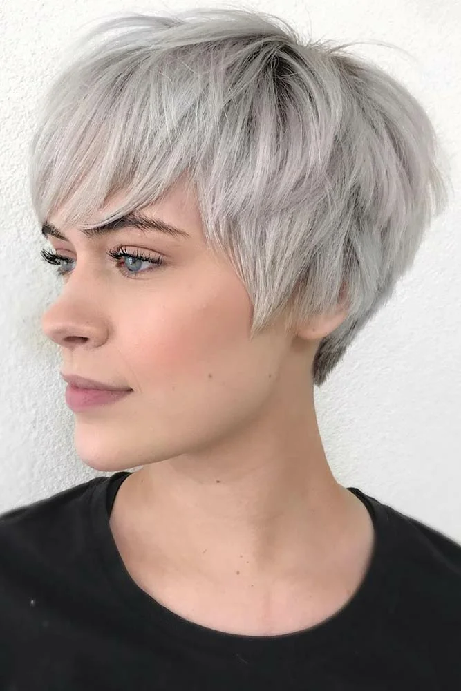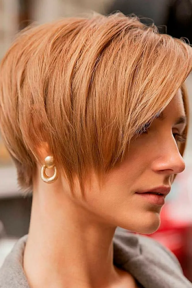 Для трикутного обличчя немає нічого кращого короткої багатошарової стрижки типу легкого Пікс-бобу. І чим неохайнішим буде укладання – тим краще! Бічний чубчик і тонкі шари будуть вашими вірними друзями.