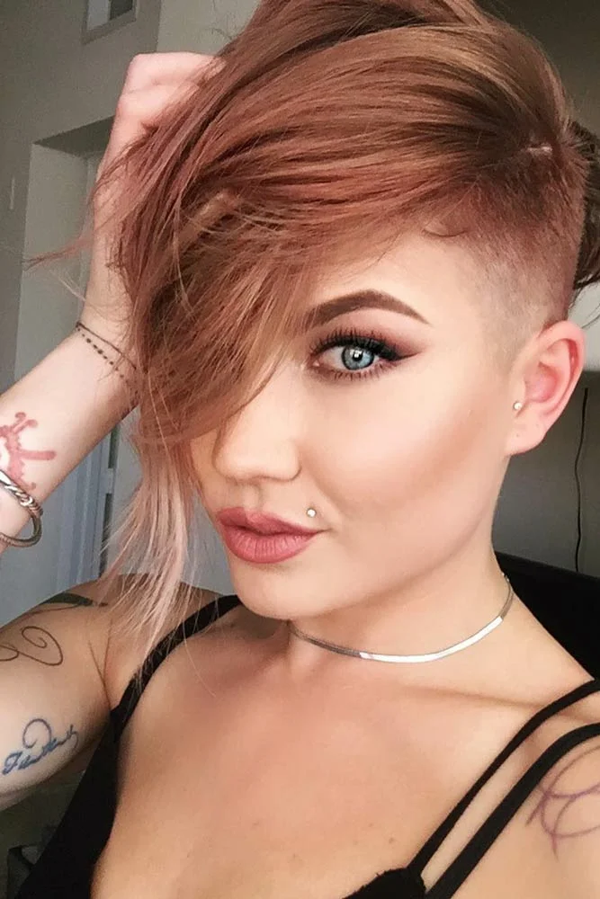 Для круглого обличчя, яке необхідно візуальне витягнути, така стрижка підходить якнайкраще. Додайте волоссю яскравості за допомогою незвичайного але м’якого відтінку рожевого міді. Цікавий образ!