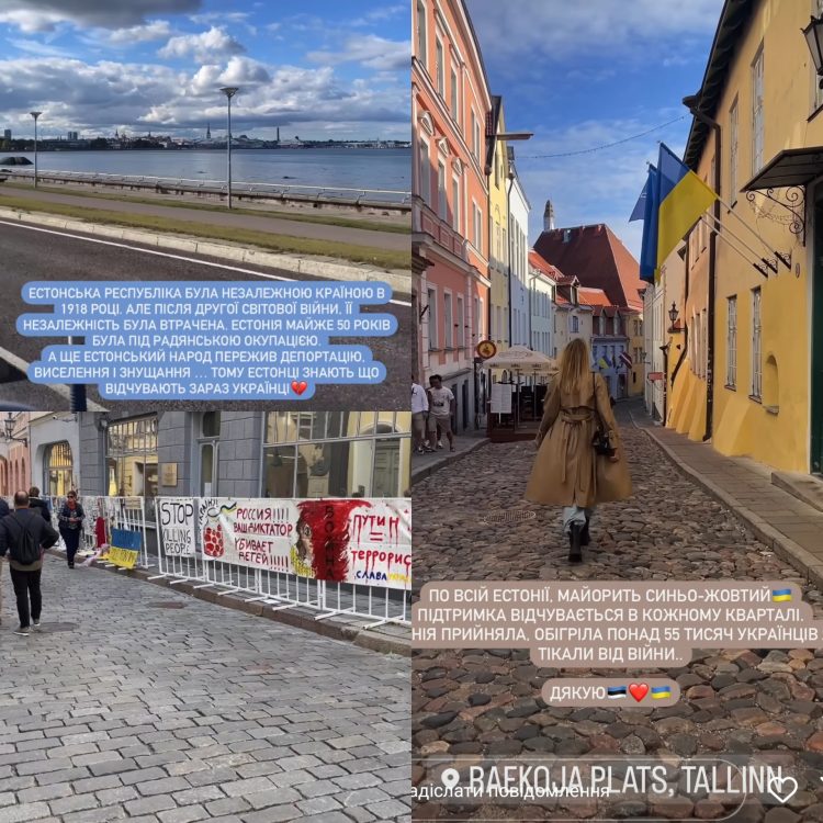 “По всій Естонії майорять синьо-жовті прапори. Підтримка відчувається у кожному кварталі. Естонія прийняла. Обігріла понад 55 тисяч українців, які тікали від війни. Дякую!”, – написала Леся в своїх Instagram-сторіс.