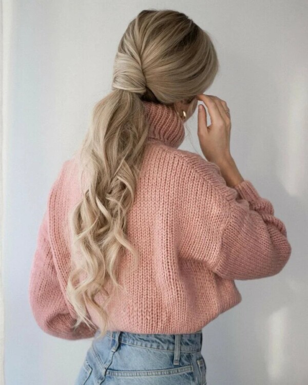 «Мальвінка» – це ще один варіант вдалої зачіски, яка відмінно гармонує на довгому волоссі. Перед тим, як робити цю зачіску, створіть легкий прикореневій об’єм на маківці і накрутіть волосся по всій довжині на плойку середнього діаметра. Щоб гумку не було видно в даній зачісці, обмотайте її одним з пасмом волосся і закріпіть їх біля основи хвоста невидимкою.