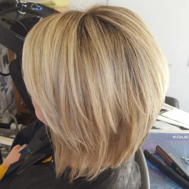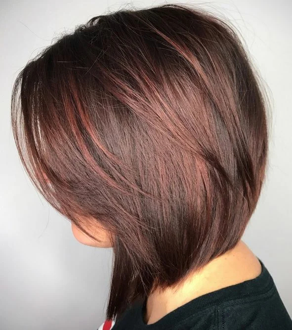 Боб з чіткими кінчиками і рівним зрізом відмінно поєднується з легкими багатошаровими пасмами зверху. Стрижка виходить об’ємною не тільки за рахунок укладання, але й за рахунок форми.