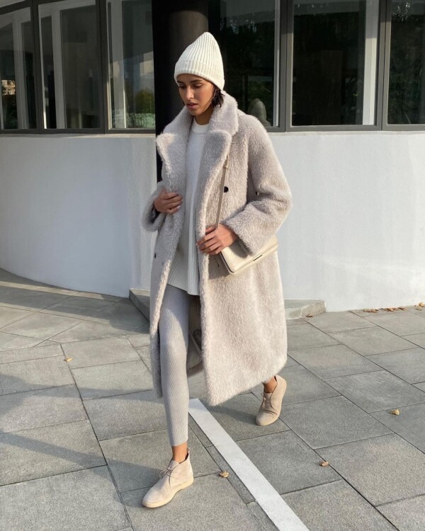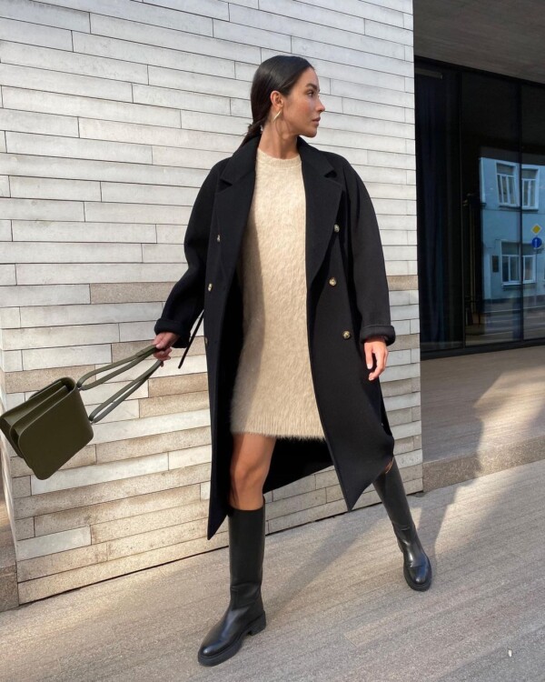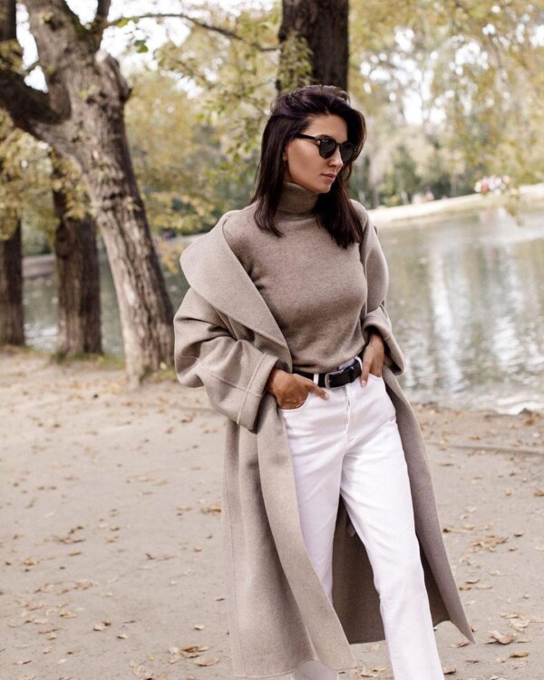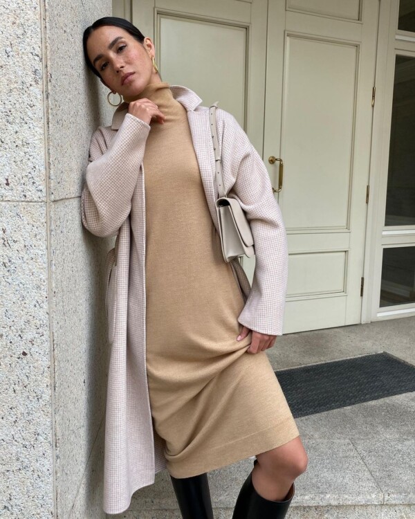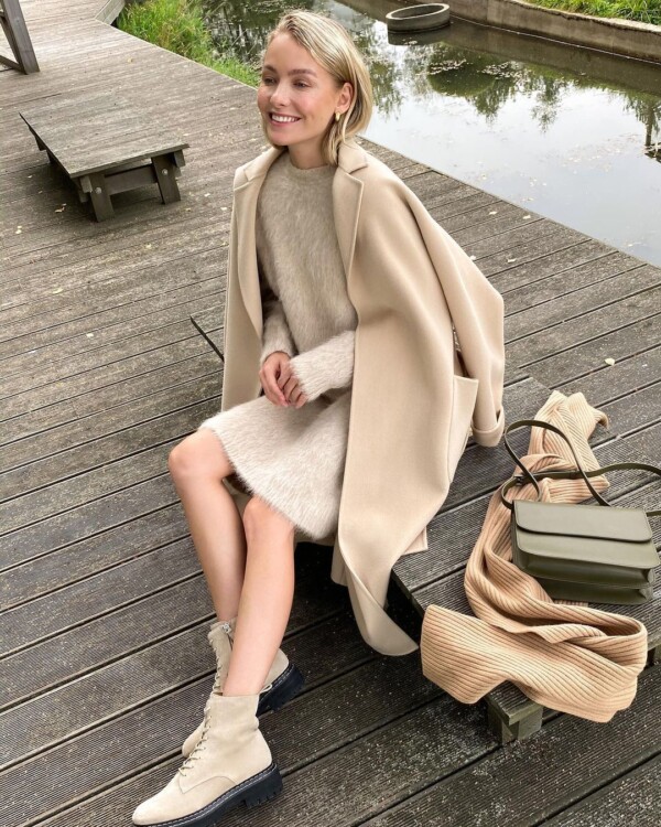 Пальто в поєднанні з теплою м’якою сукнею створює образ елегантної жінки. Найкраще вибрати найніжніший бежевий тон, який дозволить показати ваш бездоганний смак і стиль. До такого образу варто додати модні бежеві осінні черевики без каблука і теплий довгий шарф в тон до загального образу.
