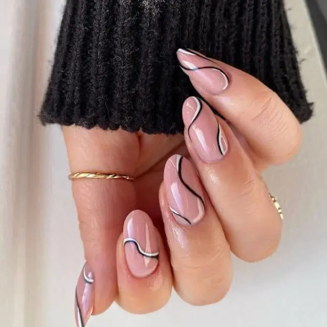 Нейтральний манікюр із чорно-білими лініями на нігтях