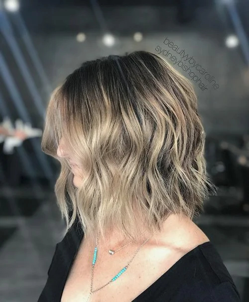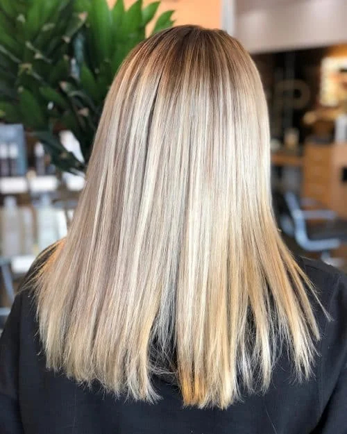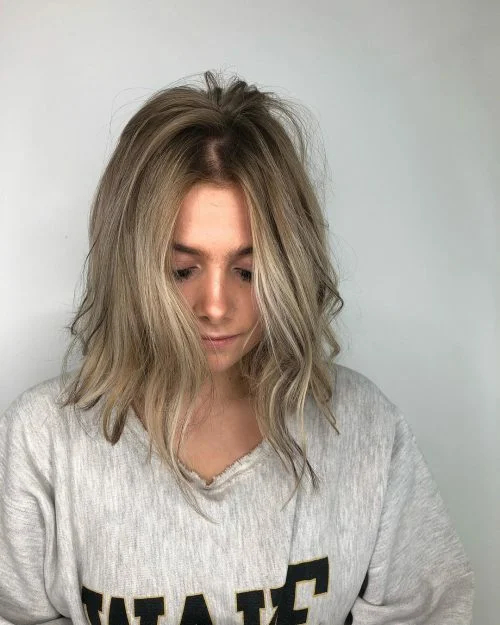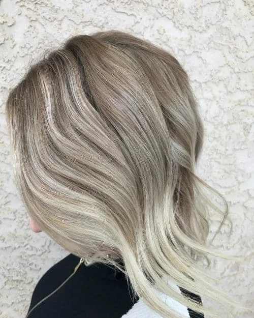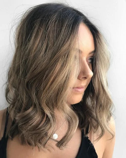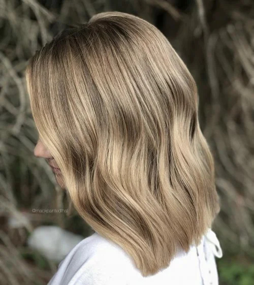 Бежевий блонд на волоссі середньої довжини виглядає просто приголомшливо. Гладкий і плавний перехід від темних коренів до світлих кінчиків виглядає натурально і м’яко.