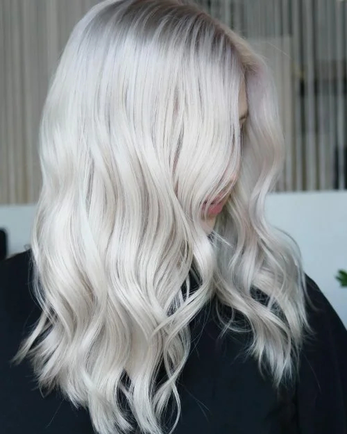 А як щодо крижаного приголомшливого блонду? Зверніть увагу на зону біля коріння – тут використано техніку балаяж з невеликим відступом від коренів. Насичений блонд від середини і до кінчиків робить образ стильним і зухвалим.