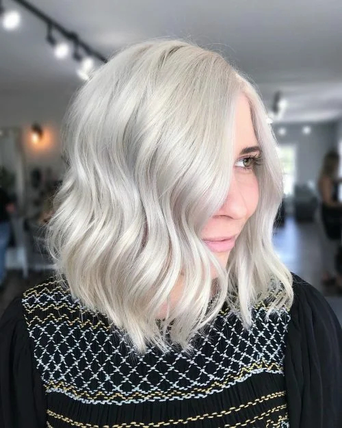 Попелястий льодяний блонд на хвилястому середньому бобі. Сріблясті відблиски додають об’єму і характеру зачісці, образ виглядає холодно, але дуже привабливо.