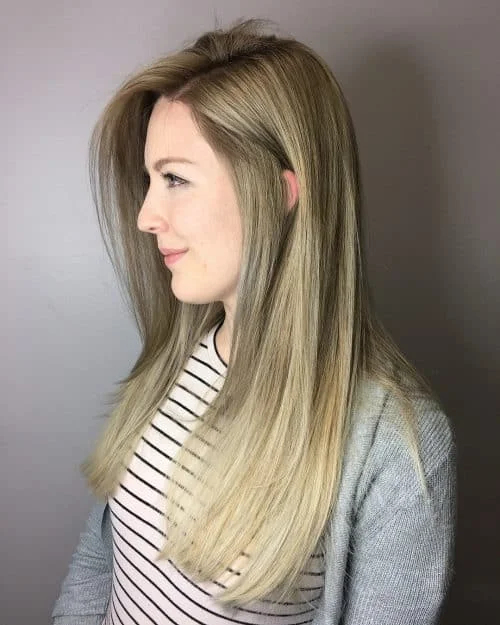 Попелясто-русявий балаяж з тонкими золотистими світлими пасмами. Таке фарбування можна робити на будь-якій довжині і текстурі волосся. Ці довгі прямі і гладке волосся стануть для вас прикладом.