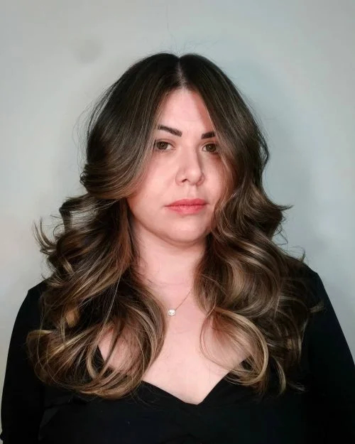 Приголомшливе рішення для брюнетки, яка хоче стати світлішою на кілька тонів. М’яке омбре з плавним переходом і тонкі світлі пасма в техніці балаяж. Все разом дає чудовий натуральний ефект, який особливо красиво проявляється в хвилястому укладанні.
