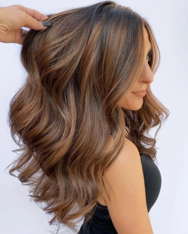 Неймовірно вишуканий колір карамельного мокко. Цей відтінок стане свіжим рішенням для фарбування темного волосся, якщо хочеться чогось незвичайного, але в рамках пристойності. Світлі карамельно-коричневі сяючі пасма чудово пожвавлять ваш темний колір волосся.
