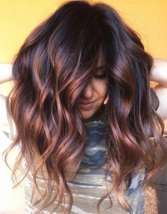 Червоно-каштанові відблиски на брюнетках виглядають просто чудово. Такий балаяж додасть теплоти в ваш образ. Пасма можуть бути тонкими і ледве помітними або, навпаки, трохи яскравішими.