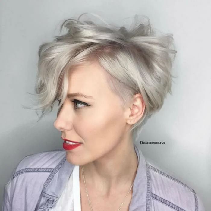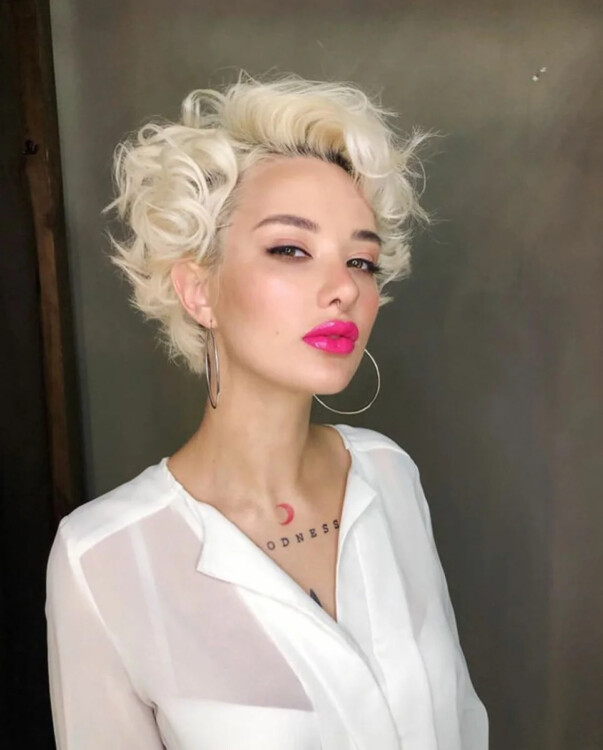 Піксі завжди буде кращою подругою жінок, адже її краса – вічна. Стрижка, яку ви бачите на цьому фото – короткий варіант класичної стрижки піксі. А білий колір для цієї стрижки – один з найпривабливіших.