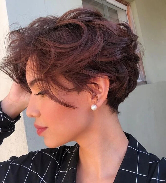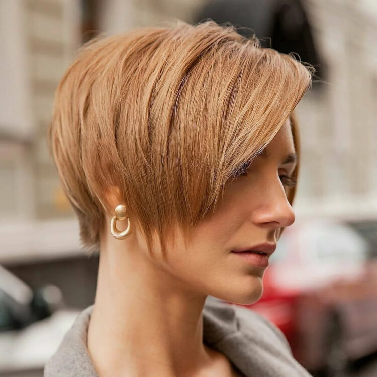 Короткі зачіски виглядають дуже стильно і виглядають доволі безтурботно. Пряма багатошарова стрижка – відмінний спосіб додати об’єму тонкому волоссю. Косий чубчик виглядає просто шикарно, а стильний відтінок додасть шарму.