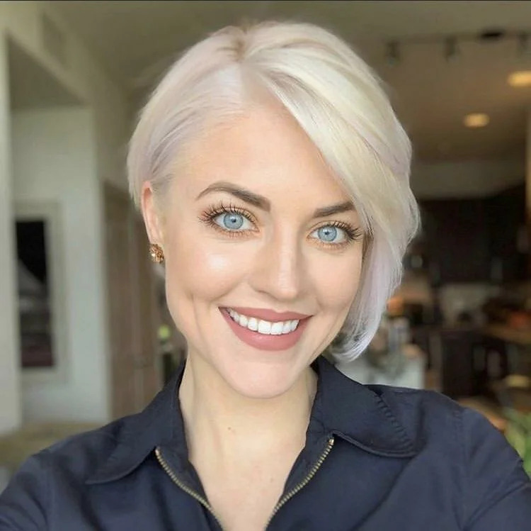 Чубчик незамінний, особливо для коротких стрижок. Цей боб в платиновому блонді дуже гарно виглядає. Попросіть свого стиліста про коротку стрижку в світлих тонах з чубчиком і м’якими пасмами, які будуть красиво обрамляти обличчя. А більш темні корені додадуть глибини цій короткій стрижці.