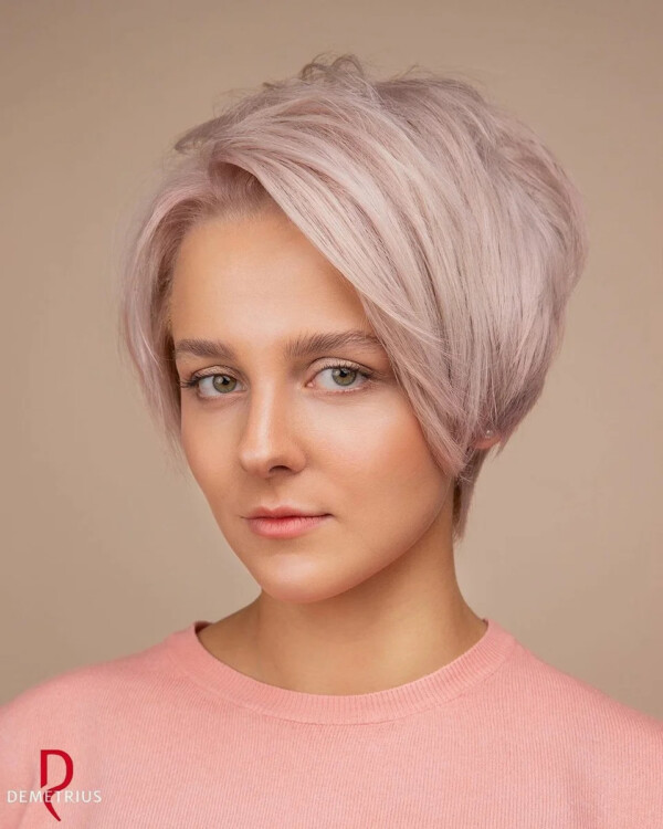 Це ще один чудовий варіант для короткого волосся. Гладке волосся виглядає вельми гламурно. А рожевий блонд, додає зачісці грайливого відтінку, який показує ваш трохи зухвалий характер.