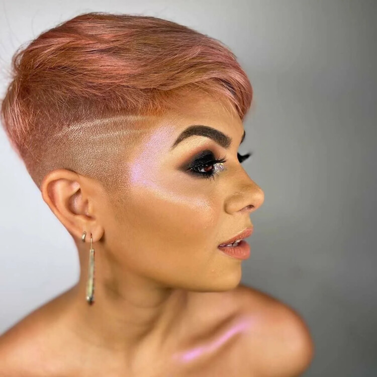 Ще більш зухвало виглядає піксі з поголеними боками. Рожевий відтінок дуже красивий, але поголені боки – ось що дійсно характеризує цей образ.