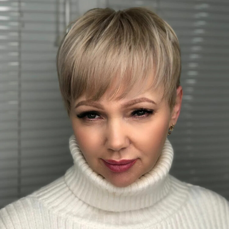 Хочете позбутися від декількох зайвих років в паспорті? Коротка стильна стрижка вирішить цю проблему! Піксі з об’ємним чубчиком чудово підкреслює очі і приховує занадто високий лоб.