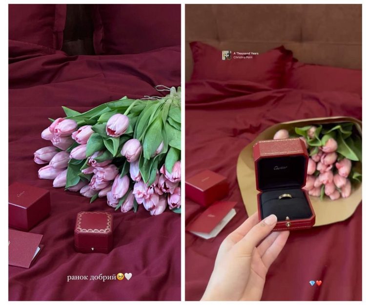 Вона показала коштовну каблучку, вартість якої близько дві тисячі євро. А ще кохана Володимира Остапчука похизувалась розкішним букетом тюльпанів. Ранок Катерини Полтавської розпочався з приємних подарунків.