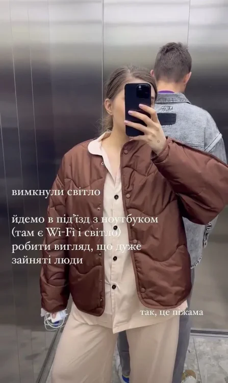 На фото він позував спиною до камери. 22-річна кохана Володимира Остапчука повідомила, що в їхньому будинку вимкнули світло. Тож пара зібралася працювати в під’їзді, де є інтернет та освітлення.