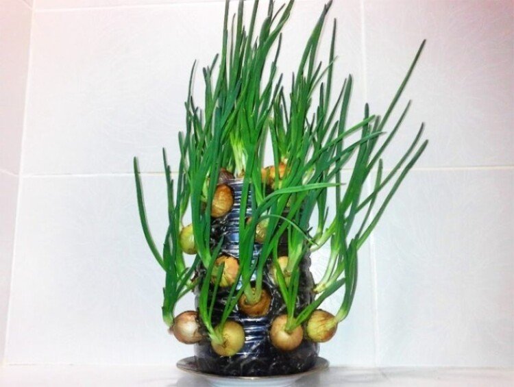 5-літрова пластикова пляшка з посадженою в неї цибулею не тільки забезпечить урожаєм зелені, але й стане оригінальною прикрасою підвіконня. Такий метод вирощування вимагає часу на підготовку, зате порадує кінцевим результатом.
