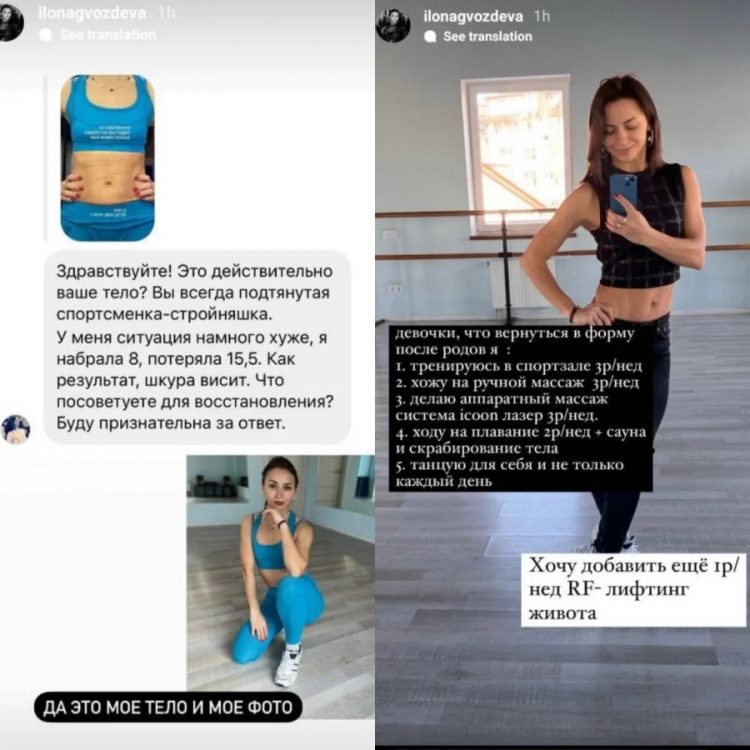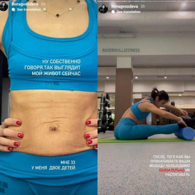 В Instagram-stories жінка опублікувала світлини, показавши, як виглядає її живіт. А ще вона продемонструвала, як займається спортом. Перед камерою Ілона Гвоздьова з’явилась у блакитному спортивному костюмі, який складався з топа та лосин.