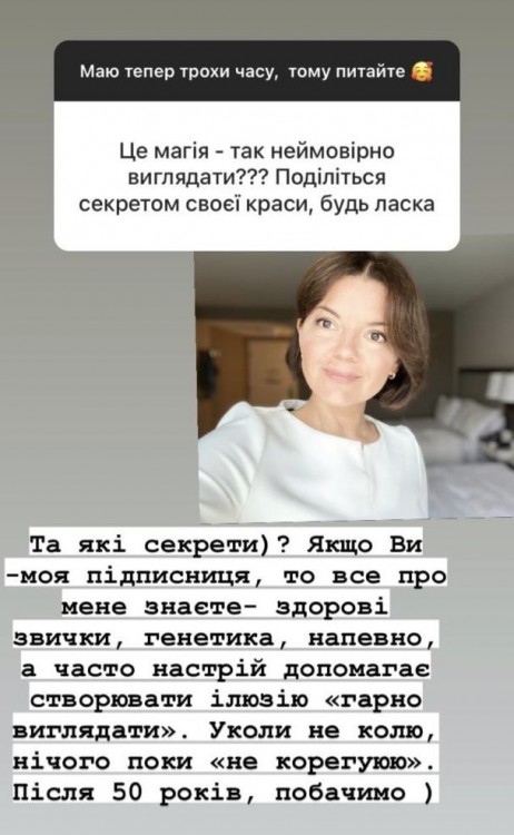 Однак, це буде мінімум через п’ять років. Шанувальники відразу засипали телеведучу компліментами. Вони повідомили, що ніякі ін’єкції їй непотрібні, адже жінка має чудовий вигляд у 45-річному віці.