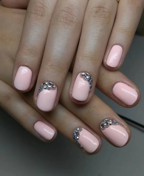 Найпростіший спосіб надати нігтям ошатного вигляду – використовувати стрази і кристали. Наприклад, ви можете попросити свого майстра викласти зі стразів посмішку на основі нігтів або піддатися старому доброму тренду і зробити дизайн по фен-шуй – виділити стразами кінчики безіменних пальців.
