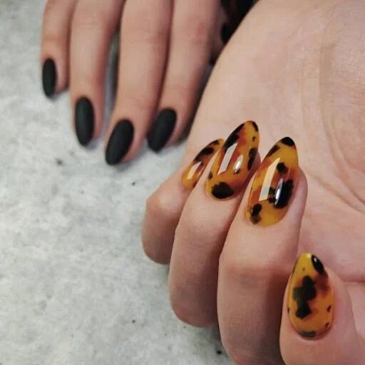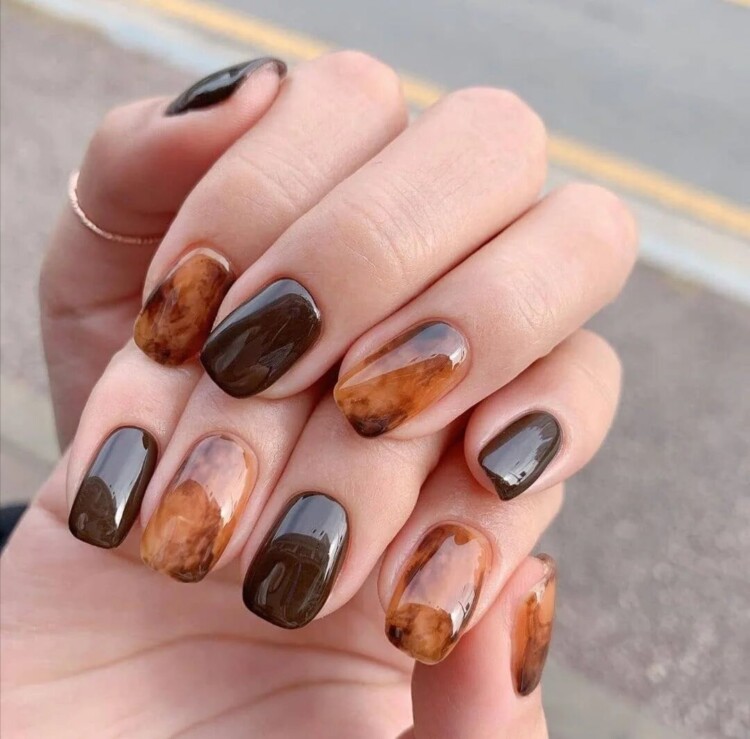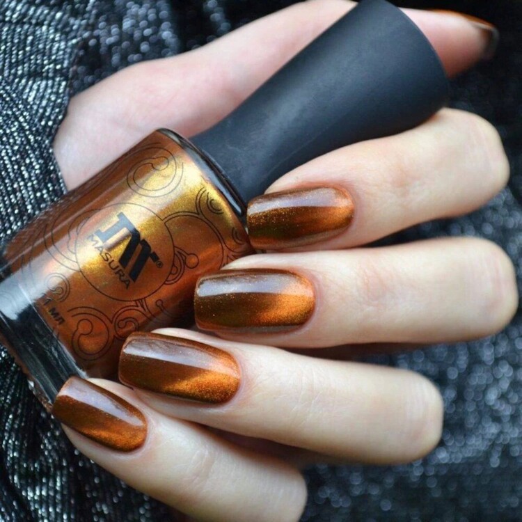 Такий колір нагадує щось космічне і незвідане. Він виглядає одночасно і спокійно, і зухвало. З бурштиновим варто бути обережніше, тому що при неправильному використанні він може буквально спотворити нігті.