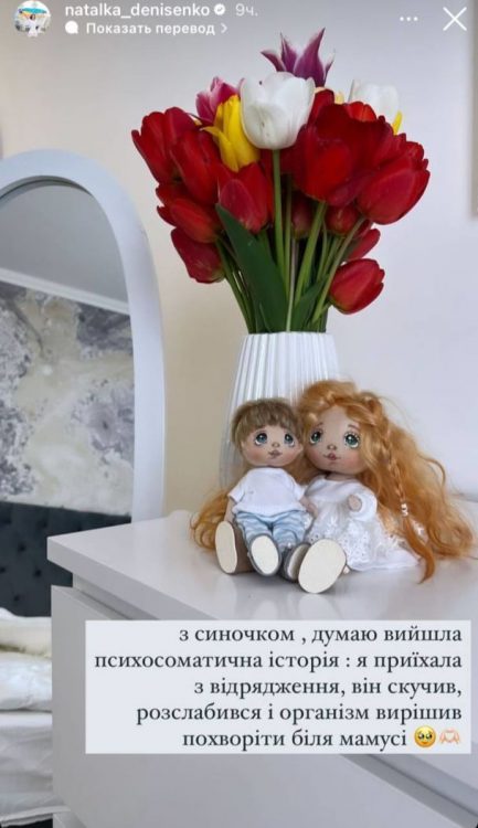 Як виявилося, хвороба маленького сина артистки – це психосоматична історія. Річ у тім, що 5-річний Андрійко довго не бачився з мамою, адже вона перебувала у відрядженні. Коли Наталія Денисенко повернулась додому, то організм сина дав слабину. За словами акторки, хлопчику призначили курс лікування. Йому робитимуть інгаляції.