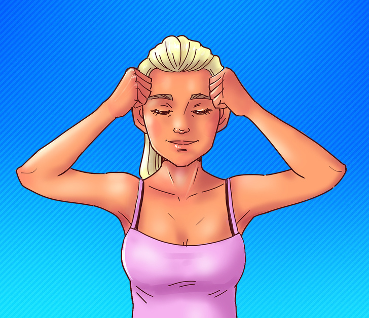 Як робити: Стисніть руки в кулаки і покладіть їх на виски ближче до чола. Масажуйте цю область круговими рухами, поступово посилюючи тиск. Кісточки вказівного і середнього пальців повинні тиснути сильніше інших.