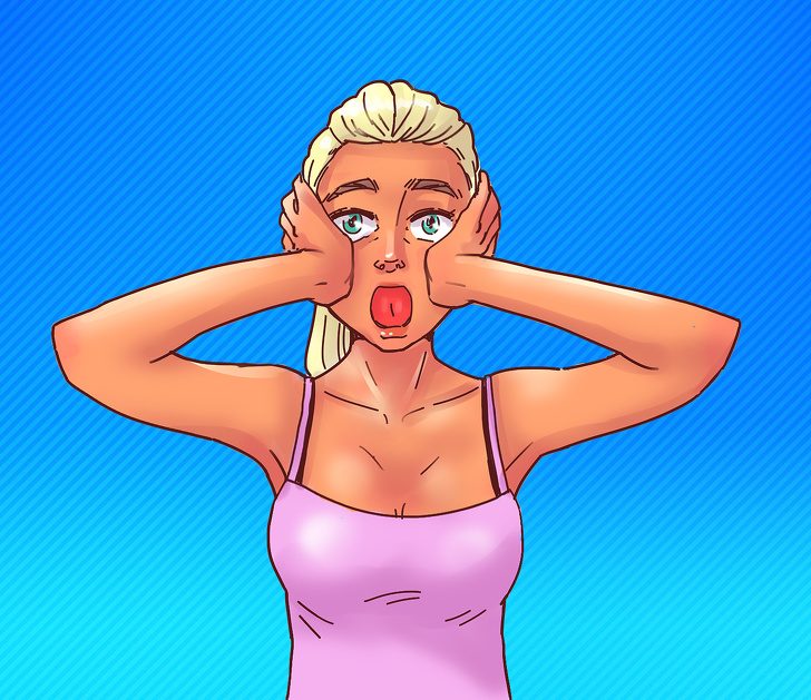 Як робити: Відкрийте рот у формі букви О, губи повинні бути натягнуті і щільно притиснуті до зубів. Закрийте очі, підніміть підборіддя вгору. Покладіть долоні на вилиці, а пальці на виски, натисніть. Затримайтеся в такому положенні 20 секунд. Повторіть 3 рази.