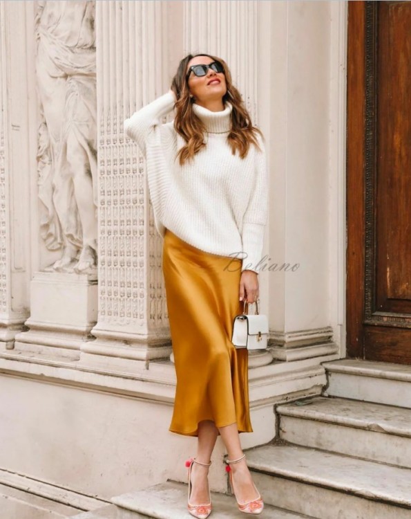 Для легкого і романтичного образу відмінним вибором стануть атласні спідниці. Така спідниця додасть вінтажності вашому образу. При правильній стилізації лук буде візуально «дорогим» і елегантним.