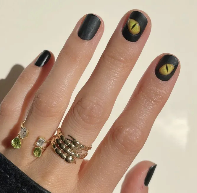 Хочеться трохи магії? Вибирайте матовий чорний лак і намалюйте на ньому котяче око. Останнє може бути як смарагдовим, так і червоним – обмежень немає.