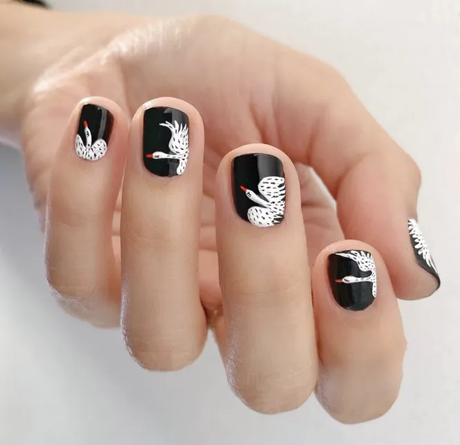 Мультяшні герої та персонажі з казок теж вітаються. Вони круто вписуються в дизайн манікюру із чорним лаком, розбавляючи готичність та додаючи нотки ніжності.