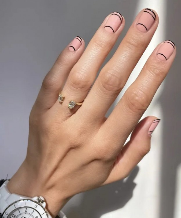 Можна зробити звичайний французький манікюр із чорним лаком, але він у вас уже, швидше за все, був. Щоб додати дизайну родзинки, зробіть кілька смужок: дві біля краю нігтя і одну біля основи.
