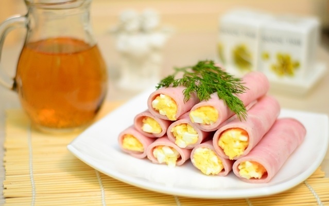 Потім на кожний шматочок шинки викладаємо яєчно-сирну начинку. Формуємо рулетики. За бажанням скріплюємо їх зубочистками. Готові рулетики викладаємо на красиву тарілку та подаємо до святкового столу. Смачного!